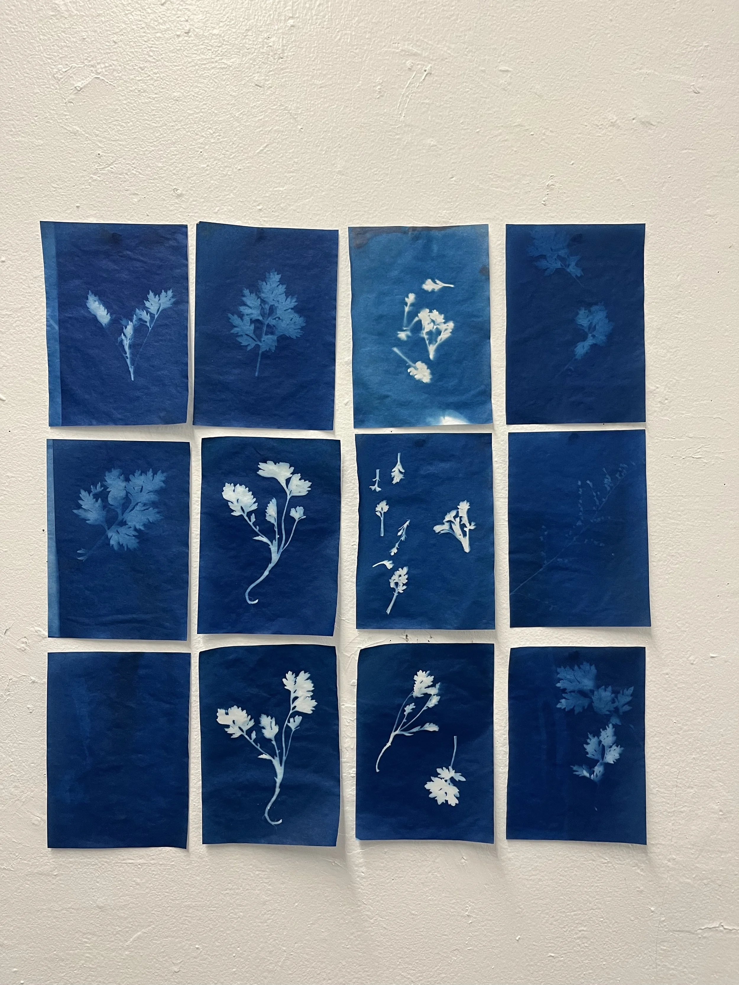 Image description: 12 cyanotype prints of mugwort at different stages of its growing season hang on a white wall. They form a 4*3 rectangle shape.