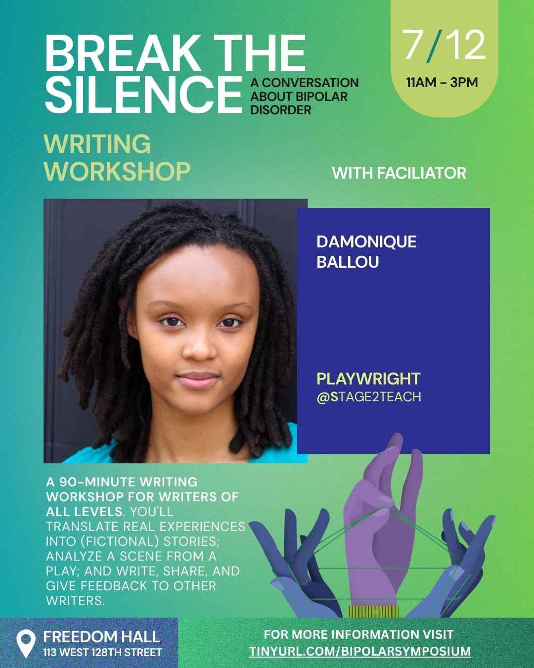 Through facilitated conversations with a mental health professional, a comedian, and a playwright, participants listened to and learned from others’ lived experiences with bipolar disorder. Following, was a writing workshop that created space for writers of all levels to translate a lived experience into a story you can share or archive.