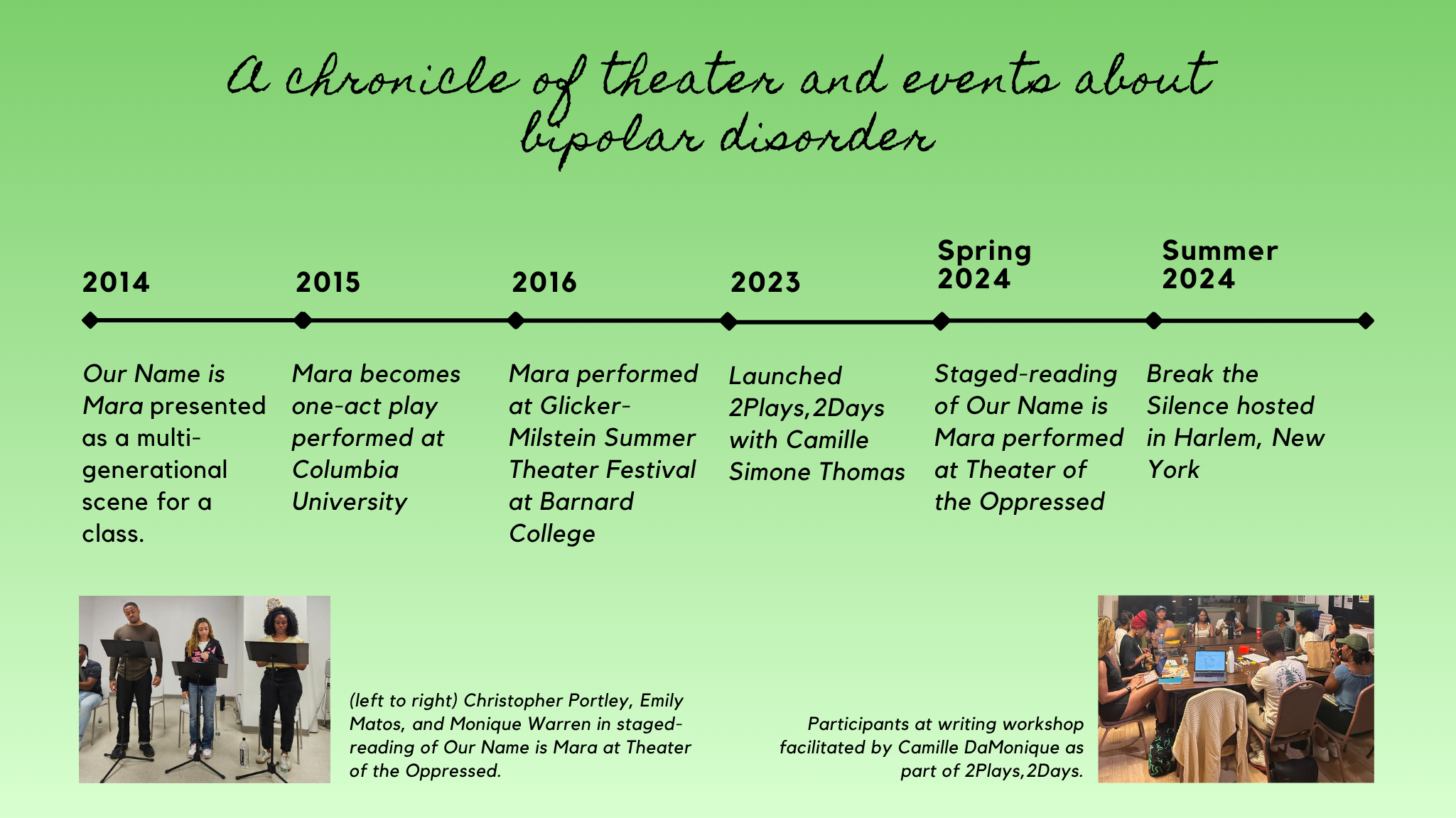 Camille Simone Thomas and I connected in 2023. She shared she was working on a play about a family member with bipolar disorder. I was curious and concerned by how freely she said that. In December we read each other’s drafts and discussed how differently we talked about our experiences. This led to “2 Plays, 2 Days.”