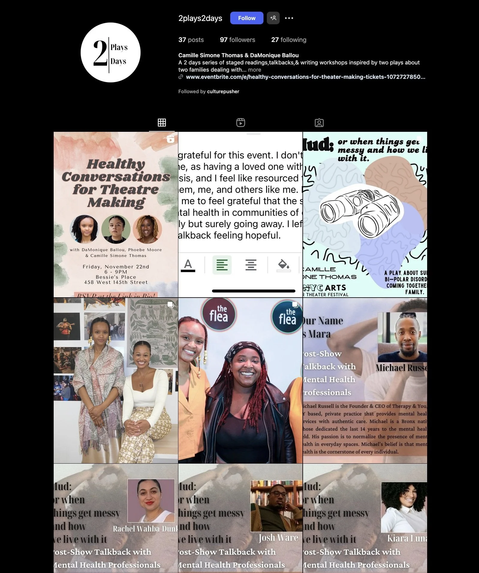 2Plays,2Days is a two-day series of staged-readings of our plays, panels with mental health professionals and workshops for the audience. By using theater to engage the community we entertained, educated and equipped audiences diagnosed with or supporting loved ones with bipolar disorder. Together we broke the silence impacting people experiencing bipolar disorder.